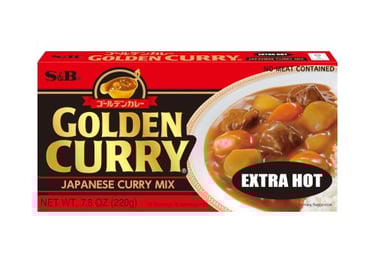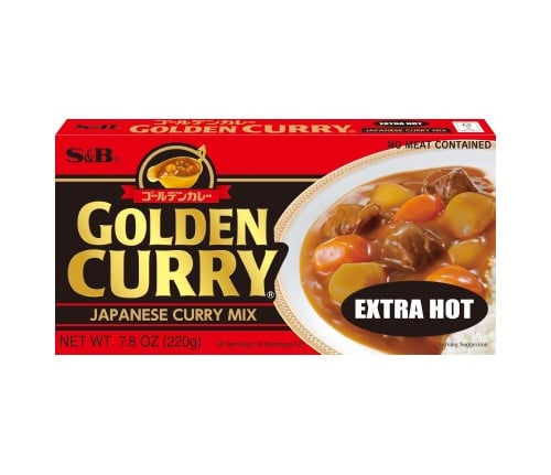 A block of Golden Curry Mix consisting of curry powder, flour, spices and seasoning could quickly transform mundane stew into fine curry simply by adding them to the mixture. Spicier than hot. It has good balance of rich aroma and spiciness. S&B Golden Curry Mix contains no meat or meat derived ingredients.